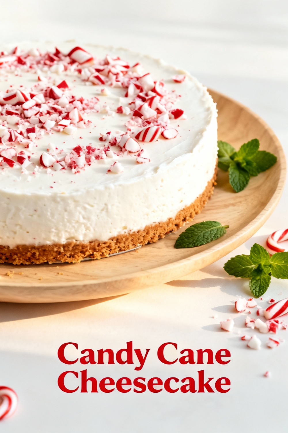 A creamy peppermint cheesecake with crushed candy canes and a festive red swirl — bright, rich, and perfect for the holidays.